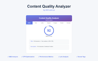 Content Quality Analyzer by AIO.com.ai adalah ekstensi Chrome yang dirancang untuk membantu pengguna menganalisis kualitas konten halaman web. Dengan alat ini, pengguna dapat menilai berbagai aspek penting seperti meta tag, kualitas teks, dan struktur tautan. Fitur ini sangat berguna untuk meningkatkan SEO (Search Engine Optimization), CTR (Click-Through Rate), dan pengalaman pengguna (UX). Selain itu, pengguna juga dapat memeriksa kecepatan halaman melalui Core Web Vitals dan mengoptimalkan gambar serta tag media sosial seperti Open Graph dan Twitter Cards.